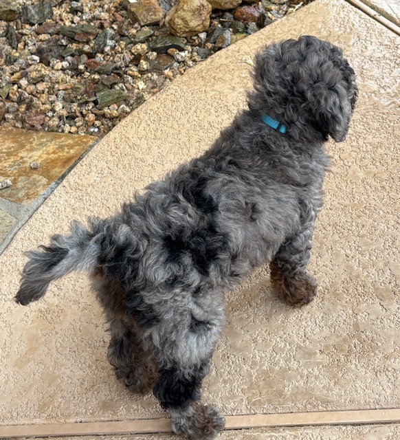 A merle doodle has unique marbled coat pattern created by the merle gene. This gene causes a beautiful mix of lighter and darker patches in the coat, resulting in an outstanding appearance that stands out among other doodle colors. The rarest goldendoodle and bernedoole colors are typically gray, silver, blue, often appearing as merle patterns achieved through multi-generaltional breeding for these recessive traits, making them hightly sought after and less common that standard colors like cream, apricot or red.
